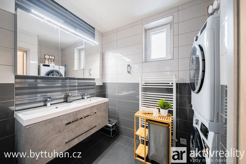 Koupelna disponuje vanou se sprchovou zástěnou, dvěma umyvadly a místem pro pračku i sušičku.