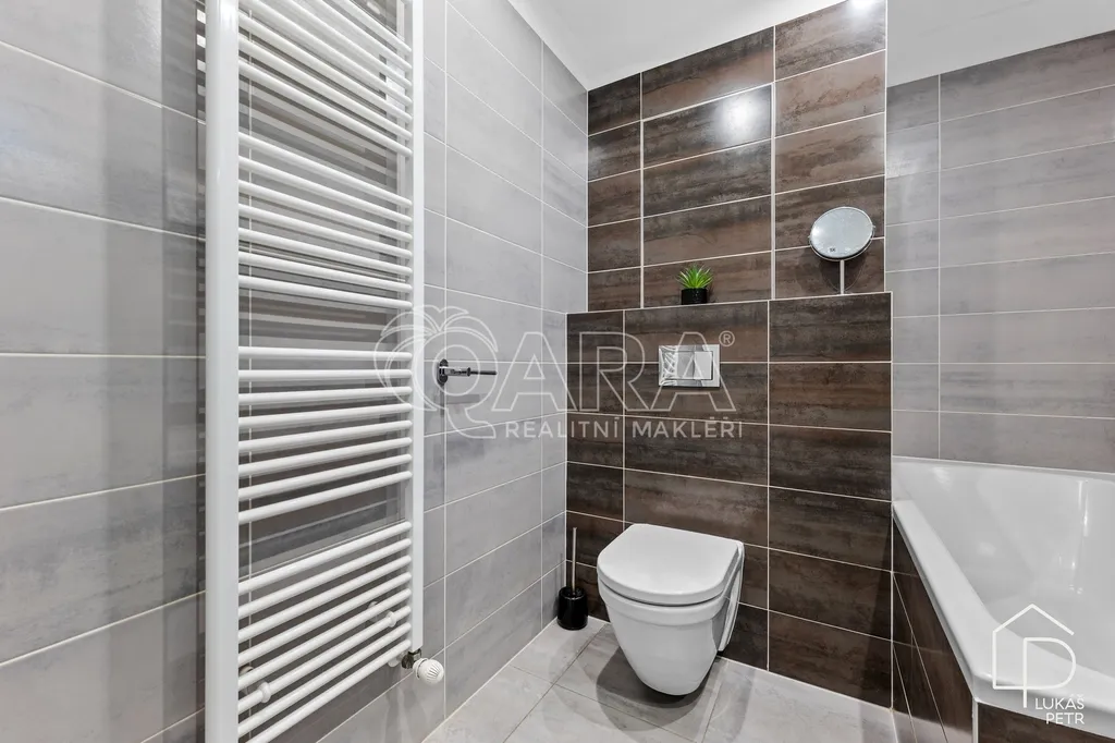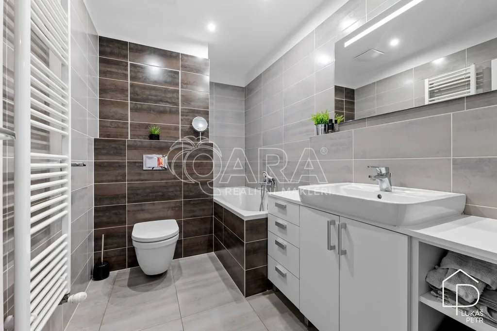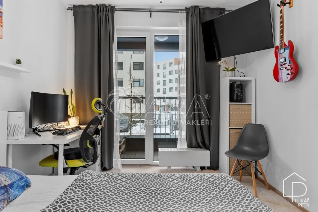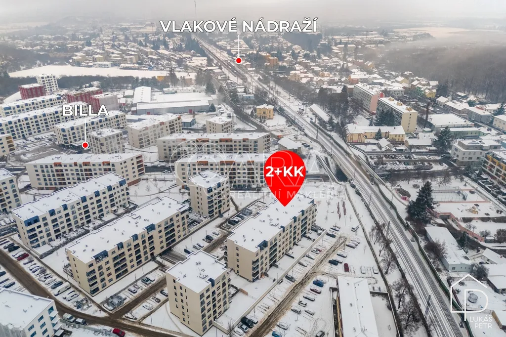 Byt 2+kk v domě z roku 2017 s lodžií, sklepem a vlastním venkovním parkovacím stáním. Nachází se ve vyvýšeném přízemí a je orientovaný na západ. Ulice před domem je slepá a slouží primárně pro rezidenty, provoz je tedy minimální a byt působí klidněji, než by člověk u Prahy čekal.