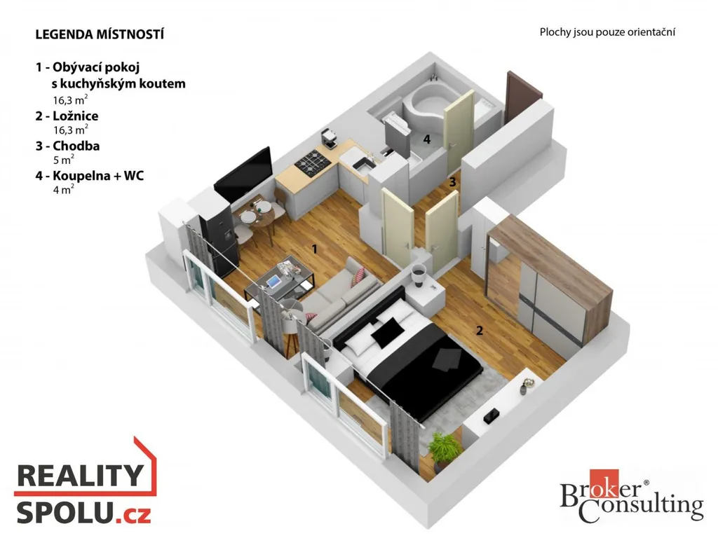 Dispozice bytu nabízí obývací pokoj s kuchyňským koutem, samostatnou ložnici a koupelnu s vanou a WC. Byt je udržovaný, světlý a působí velmi příjemným dojmem.