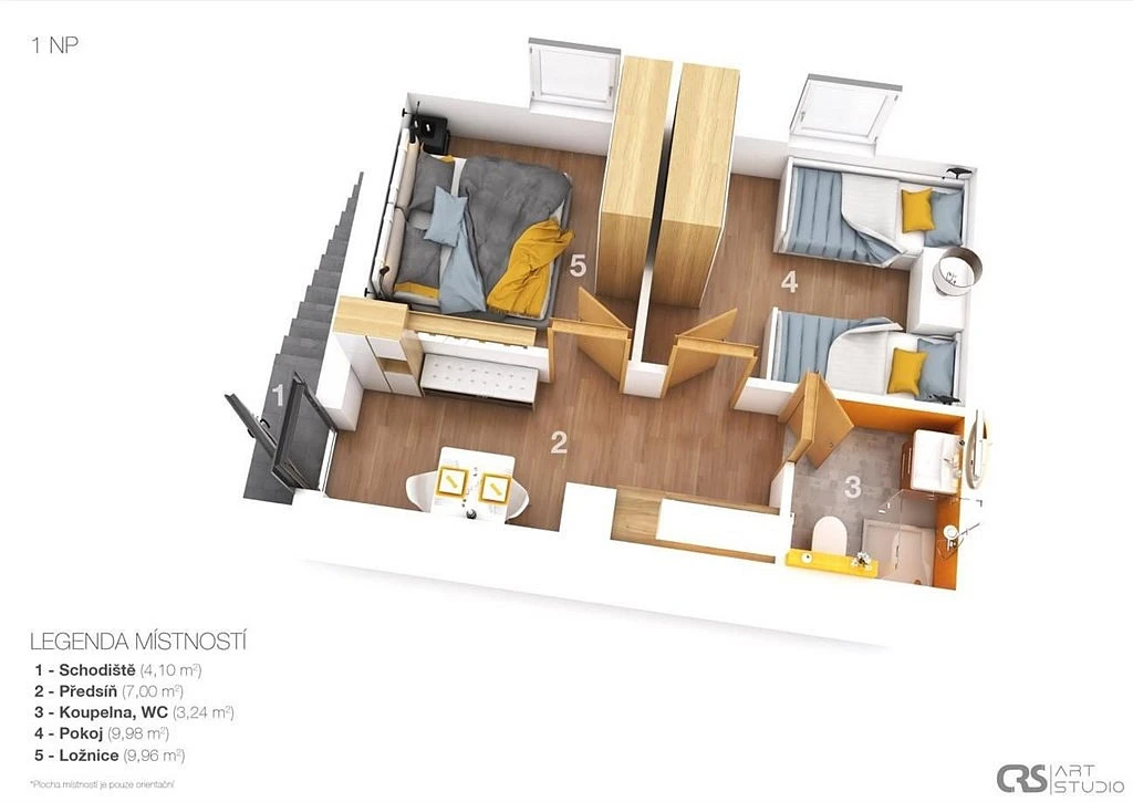 Dále vinařská nemovitost nabízí ubytování pro 4 až 6 osob ve dvou pokojích v patře, které je přístupné po venkovních schodech vedle stavby. Nedílnou součástí obytného patra je koupelna s dalším WC a sprchovým koutem a zároveň kuchyňský kout se základními potřebami. Oba pokoje i společné prostory jsou vytápěny elektrickými přímotopy. Z chodby je možný díky skládacím půdním schodům vstup do podkroví. Má ale nízkou světlo výšku a tak by případné dobudování spaní bylo spíše pro děti.