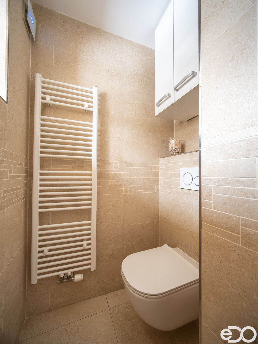 Z verandy dále mohu pokračovat na toaletu s plynovým kotlem, do koupelny se sprchovým koutem a prostorem pro pračku a sušičku. Dále se dostávám do plně vybavené kuchyně na míru opět v nadstandardním provedení s jídelním stolem a navazujícího velkého obývacího pokoje.