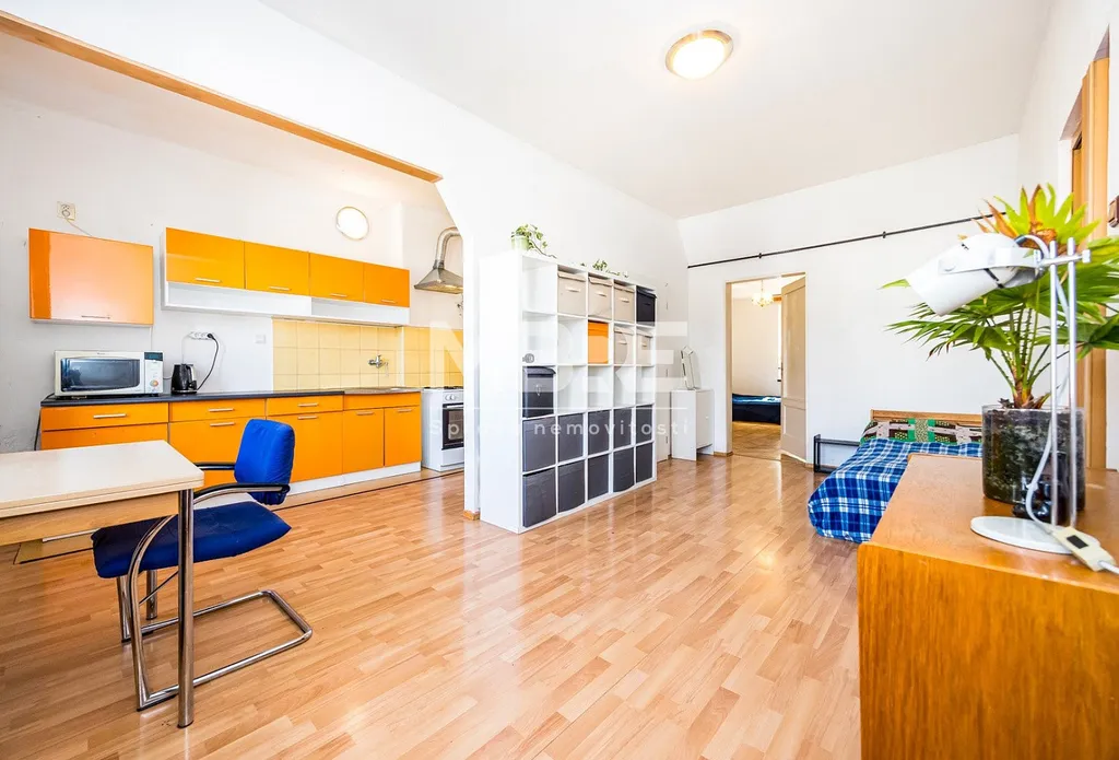 Bytová jednotka disponuje prostorným obývacím pokojem s kuchyňským koutem, předsíni se vstupem na přizděný balkón, samostatným neprůchozím pokojem, koupelnou se sprchovým koutem a samostatné WC.