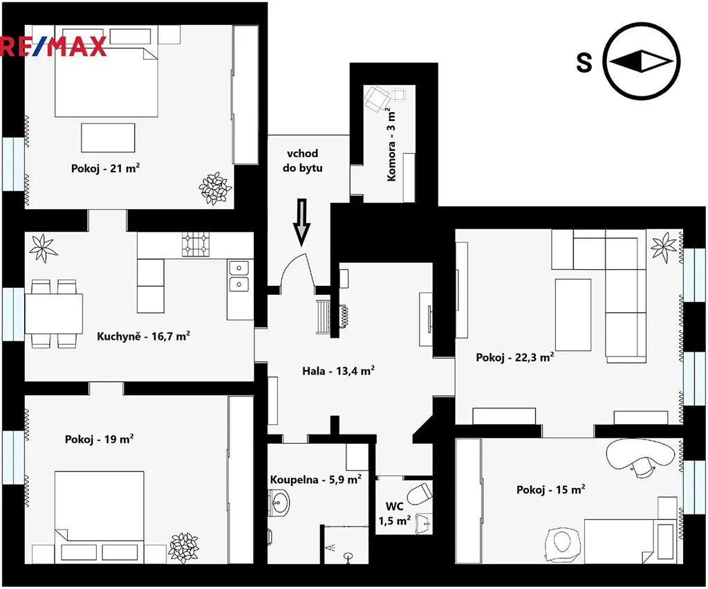 Plánek, půdorys bytu a také virtuální prohlídka jsou k dispozici ve fotogalerii.