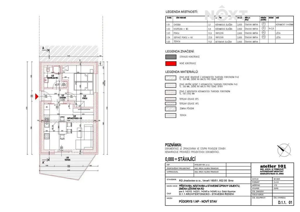 1. nadzemní podlaží – samostatná jednotka 2+kk (43,4 m²) s terasou 12 m²