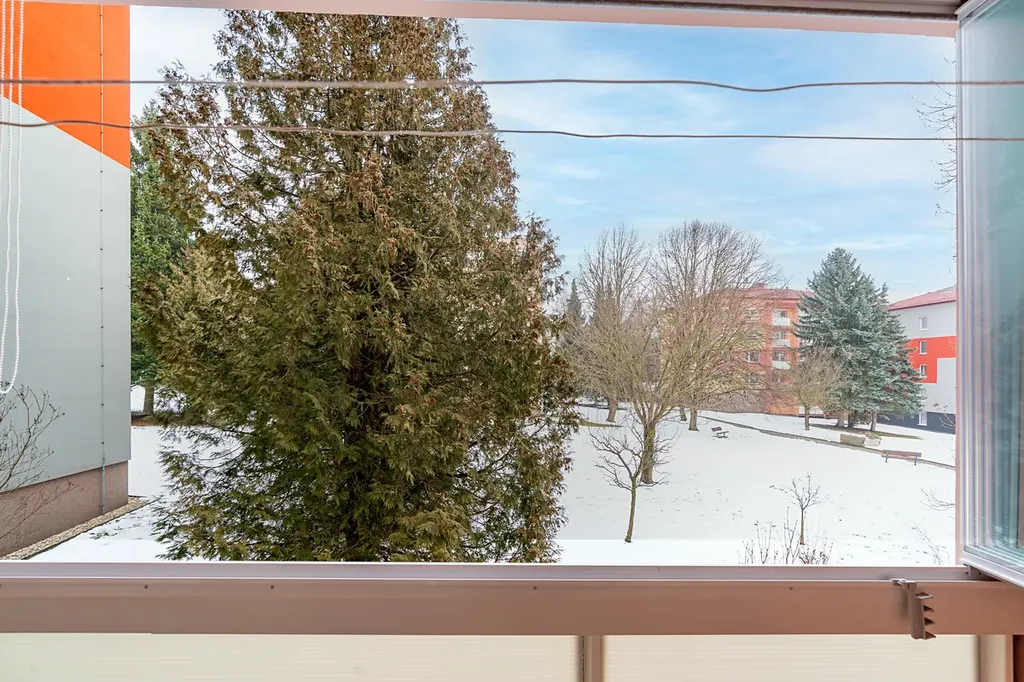 Byt nabízí příjemný výhled do okolní zeleně, což umocňuje pocit klidu a propojení s okolím. Díky své orientaci je byt velmi světlý a působí harmonicky.