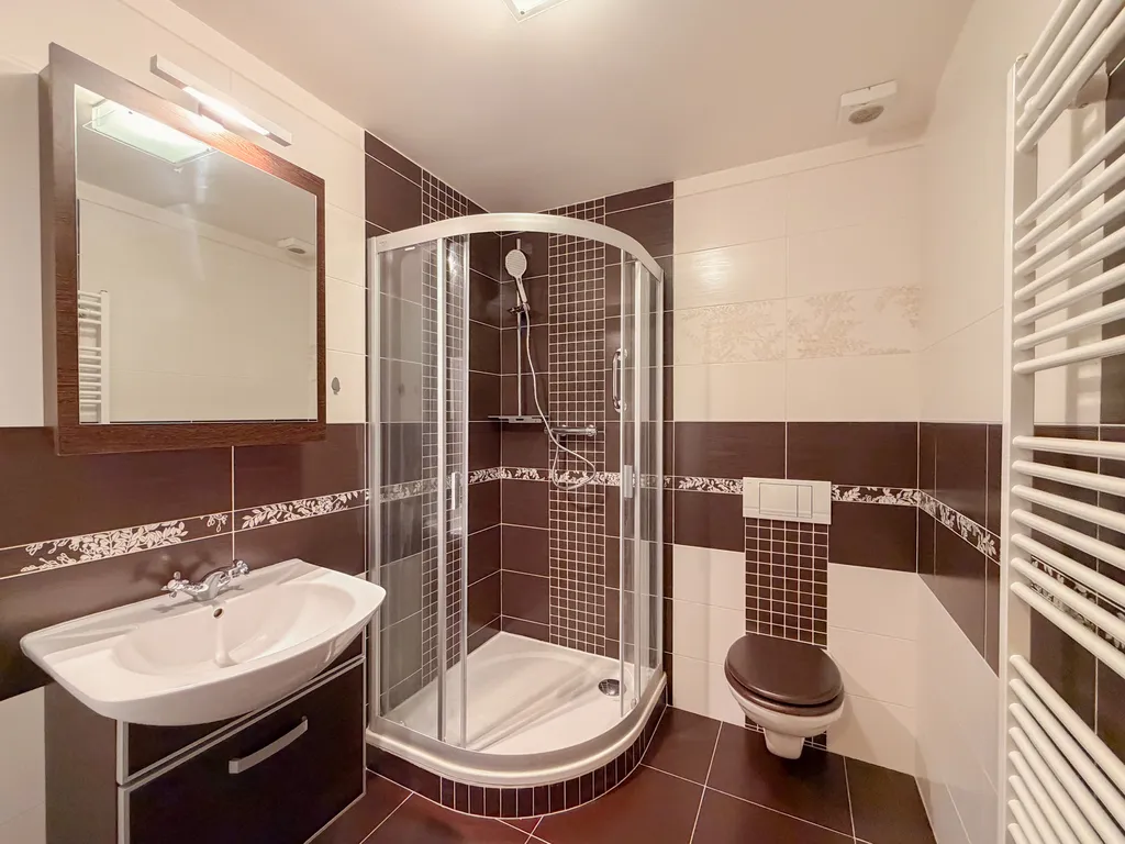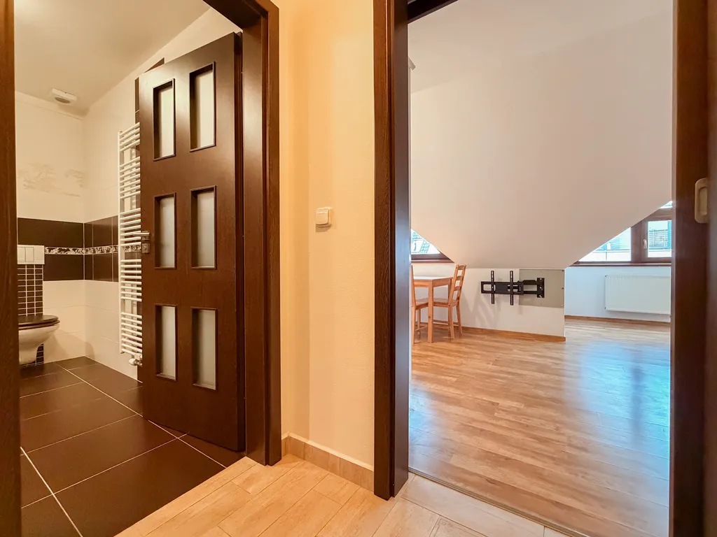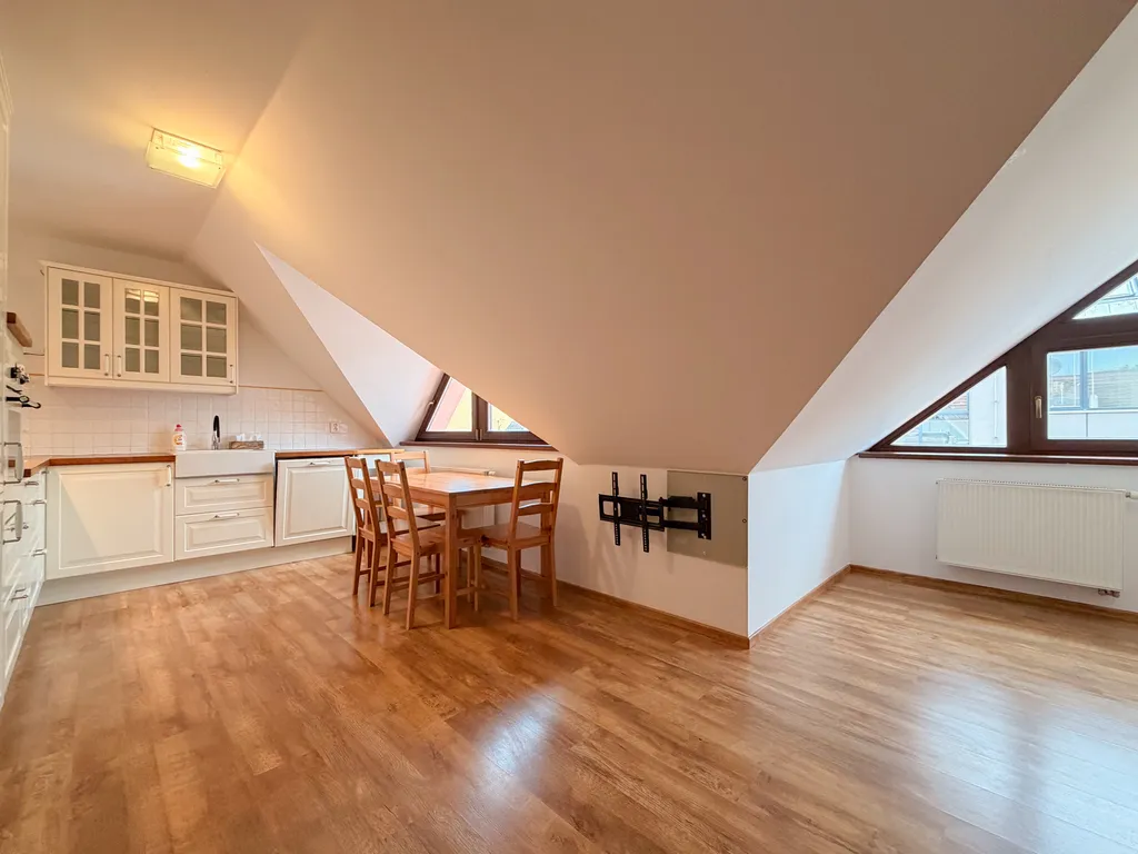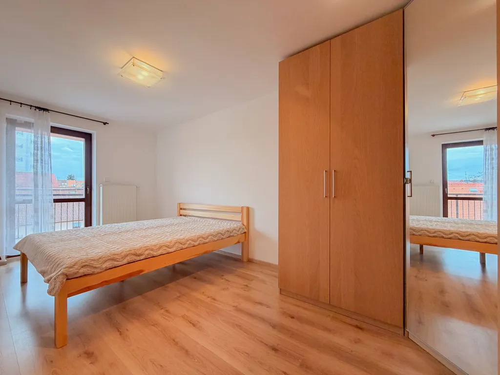 Byt je po kompletní rekonstrukci a je připraven k okamžitému nastěhování. Disponuje vstupní chodbou, ze které se dostanete do obývacího pokoje s rustikálně navrženou kuchyňskou linkou, vybavenou spotřebiči (myčka, horkovzdušná trouba, lednice, mrazák), prostornou koupelnou s WC, sprchovým koutem, pračkou a sušičkou a světlou ložnicí s úložnými prostory. Z ložnice je vstup na balkon situovaný do vnitrobloku - příjemný pro posezení či ranní kávu. Jako poslední k bytu náleží také sklepní kóje o velikosti 4.48 m², kde můžete v klidu uložit své sportovní vybavení či další věci. Byt se pronajímá včetně vybavení dle fotografií.