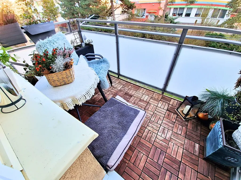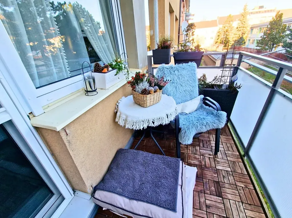 K dispozici balkon o výměře 4,5 m2 s výhledem na Svatou Horu.