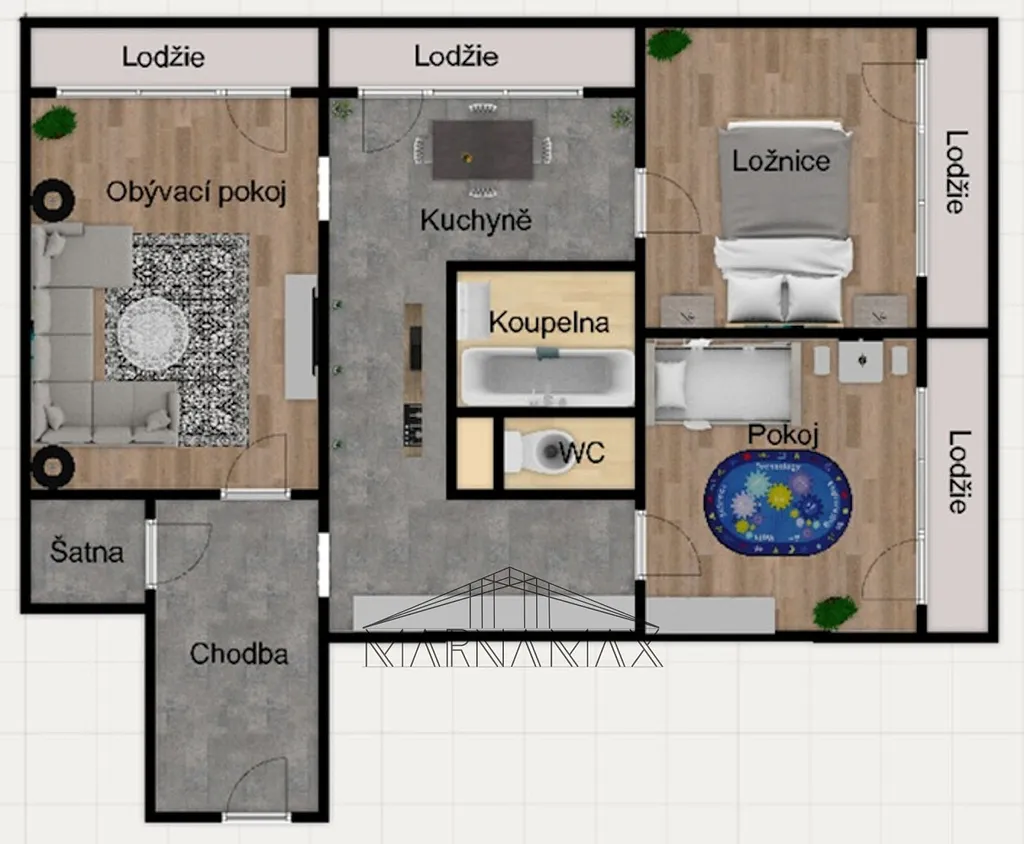 Čtyři lodžie zajišťují dostatek světla, čerstvého vzduchu a výhledu do okolí – jde o benefit, který se v této kategorii bytů vidí jen výjimečně.