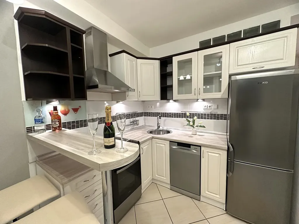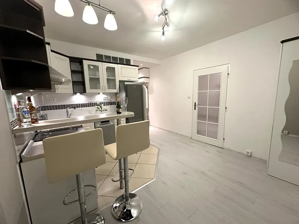moderní kuchyňskou linku se spotřebiči (myčka, lednice) a barový pult – perfektní pro ranní kávu i večerní sklenku,