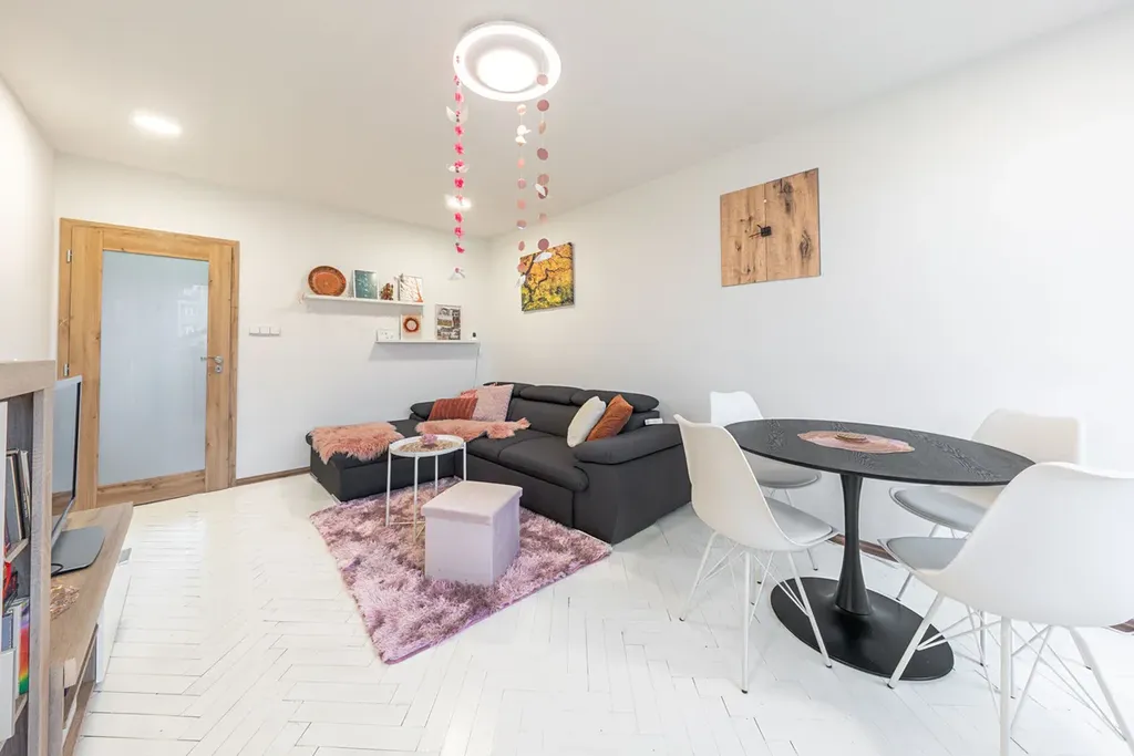 Byt nabízí velmi praktické uspořádání. Dva pokoje: jeden prostornější s balkónem, vhodný jako obývací pokoj a druhý pokoj, který je vhodný jako ložnice nebo pracovna, přičemž v obytných místnostech byly citlivě zrenovovány původní dřevěné parkety, které dodávají interiéru jedinečnou atmosféru. V ostatních částech bytu je položena moderní a odolná vinylová podlaha.