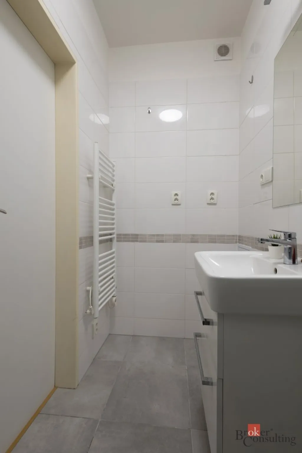 Moderní vybavení: Kuchyňská linka je osazena spotřebiči (indukce, el. trouba, myčka, digestoř). Samostatné WC a moderní koupelna se sprchovým koutem jsou samozřejmostí.
