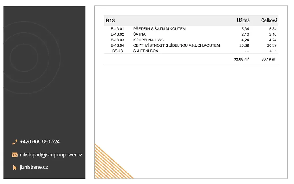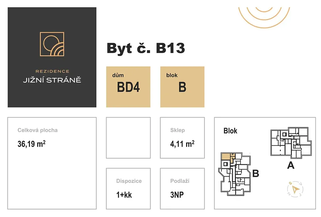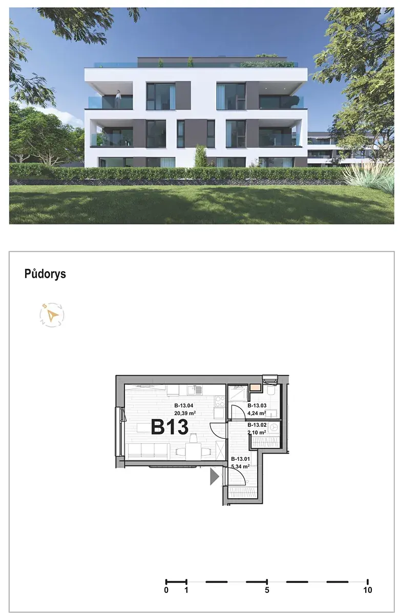 Jednotka B13 sestává z obývacího pokoje s kuchyňským koutem, koupelny s WC, předsíně a šatny. Součástí je i sklepní box v suterénu budovy.