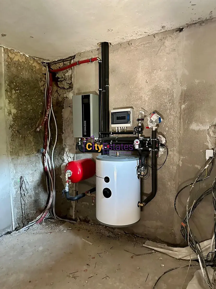Vytápění je řešeno již zabudovaným tepelným čerpadlem, voda z vlastní studny. Aktuálně je na pozemku septik – na stavbu ČOV je již hotový projekt a vydáno stavební povolení.