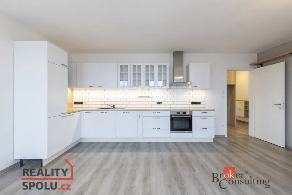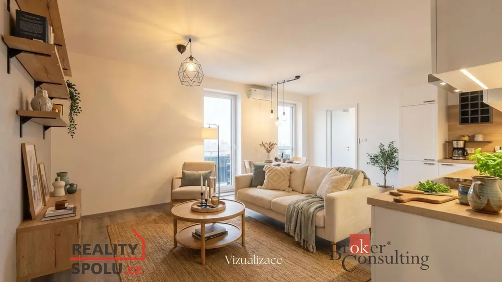 Dispozice bytu zahrnuje vstupní halu s chytře využitým prostorem vestavěnými skříněmi (včetně na míru připraveného místa pro pračku a sušičku) a prostorný obývací pokoj s kuchyňským koutem. V bytě je dále komfortní ložnice, další pokoj vhodný jako pracovna nebo dětský pokoj, koupelna, samostatné WC a balkon.