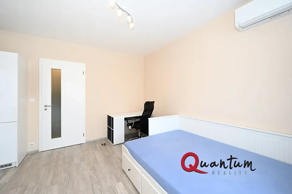Obytná část je zařízena rozkládací postelí s možností rozložení až na šířku 160 cm, počítačovým stolem se židlí a dále jídelním stolem se židlemi. Velkou výhodou bytu je klimatizační jednotka, která zajišťuje příjemnou regulaci teploty zejména v letních měsících.