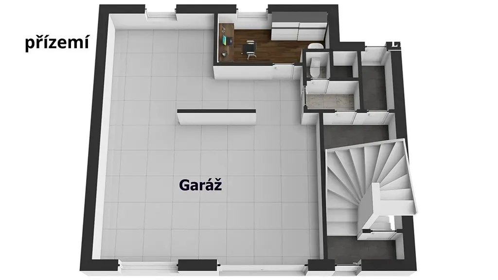 Přízemí: prostorný multifunkční prostor ideální pro showroom, dílnu, garáž, ateliér nebo provozovnu s užitnou plochou 72m2.