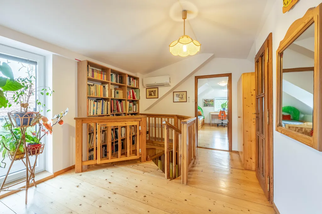 V prvním patře se nachází 2 pokoje, WC, malá šatna a velká průchozí šatna, která může sloužit jako další pokoj.