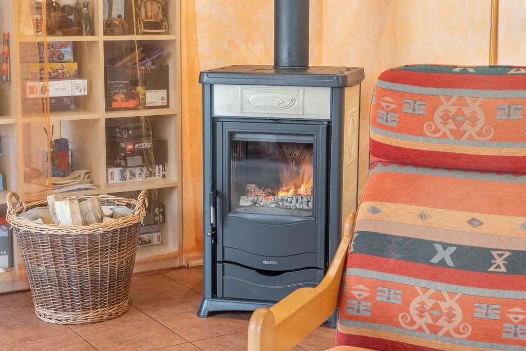 Vytápění domu je zajištováno tepelným čerpadlem vzduch - vzduch (v pokojích jsou klimatizační jednotky), dále je k dispozici elektrokotel - radiátory, a v obývacím pokoji krbová kamna.