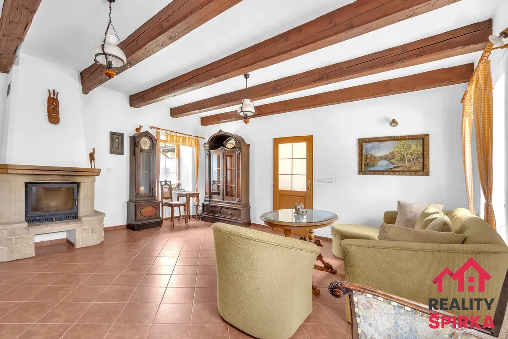 2+kk s velkorysou místností se stylovými krovy – kuchyň, jídelna a obývák v jednom, samostatný pokoj, krb s rozvody tepla, koupelna se sprchovým koutem, samostatné WC, chodba, spíž.