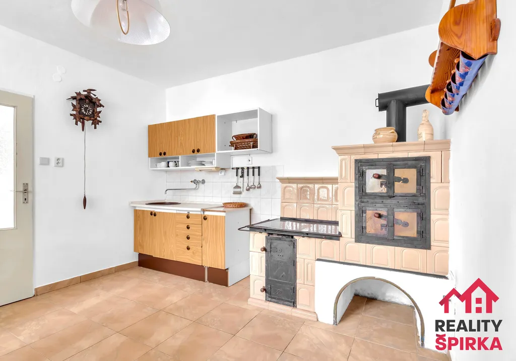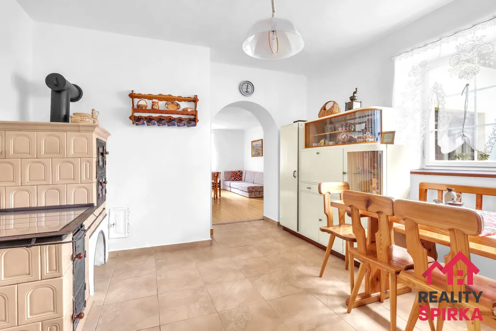2+1 s útulnou kuchyní, kachlovými kamny, dvěma pokoji (jeden s krbovými kamny), novou koupelnou se sprchovým koutem, samostatným WC, spíží a malou relaxační místností s francouzským oknem a výhledem do zeleně uspořádaného dvorku.