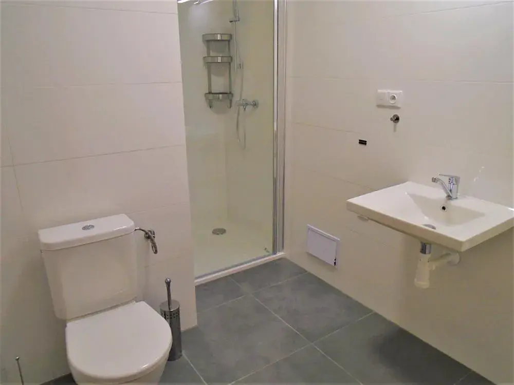 V koupelně je sprchový kout, umyvadlo a místo na pračku.