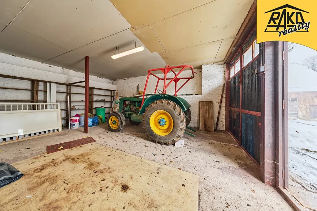 Příslušenství: garáž pro dvě auta + chlív pro domácí zvířata, stodola na skladování sena a parkování pro traktor, zahradní altán, skleník, částečné oplocení