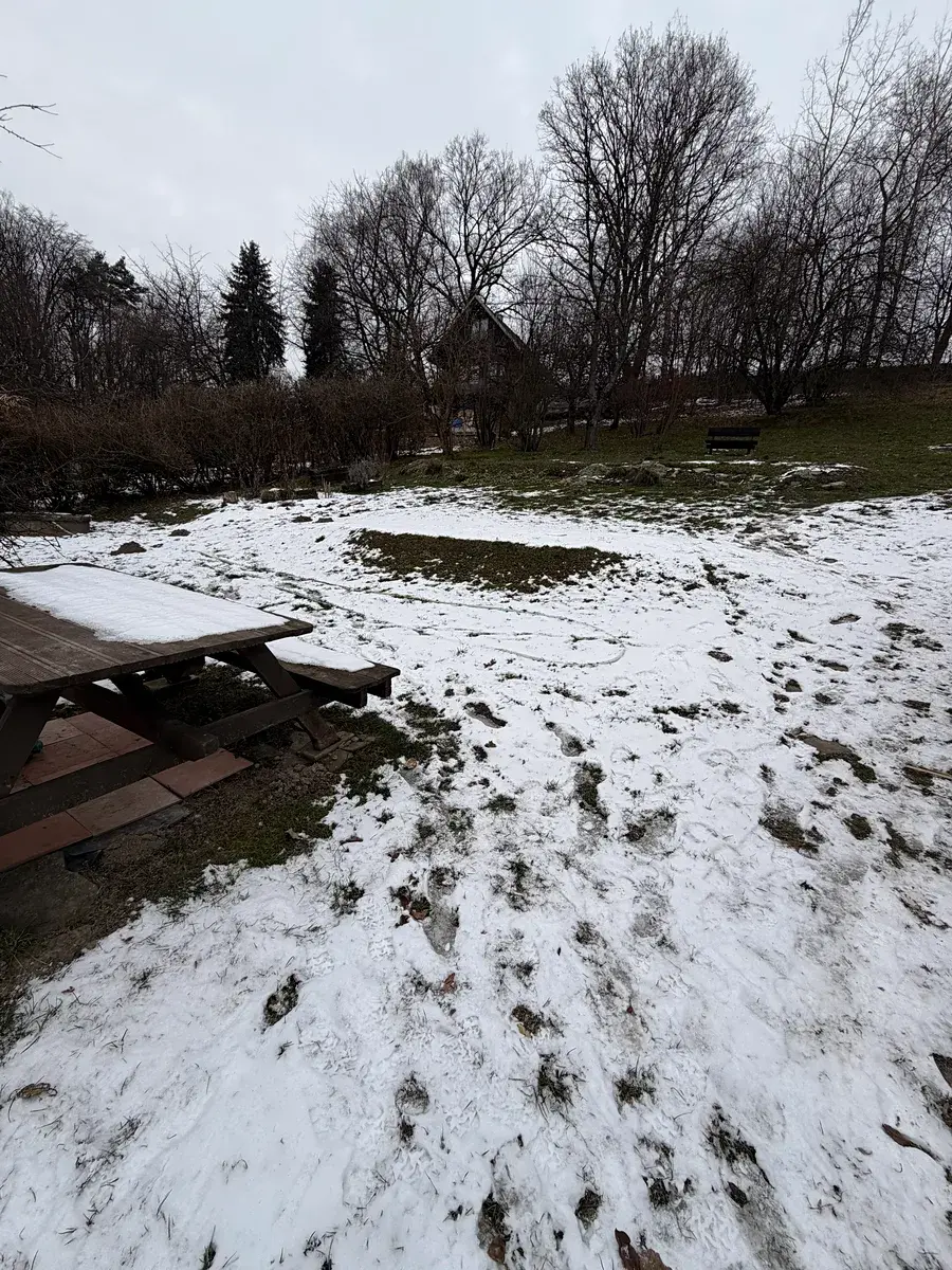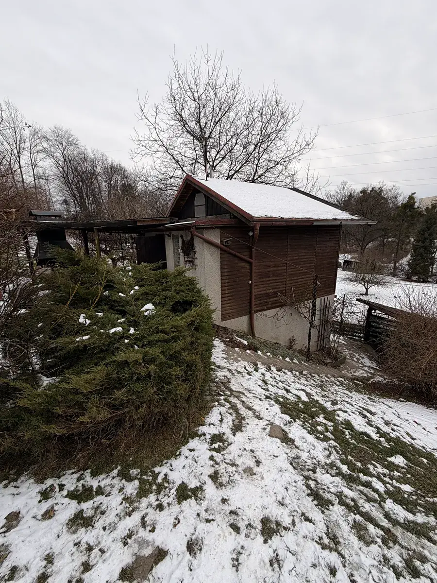 Na pozemku stojí stavba, která je využívaná jako chatička se společenskou místností, zavedené WC, možností přespání v podkroví a s úložnými prostory v přízemí.