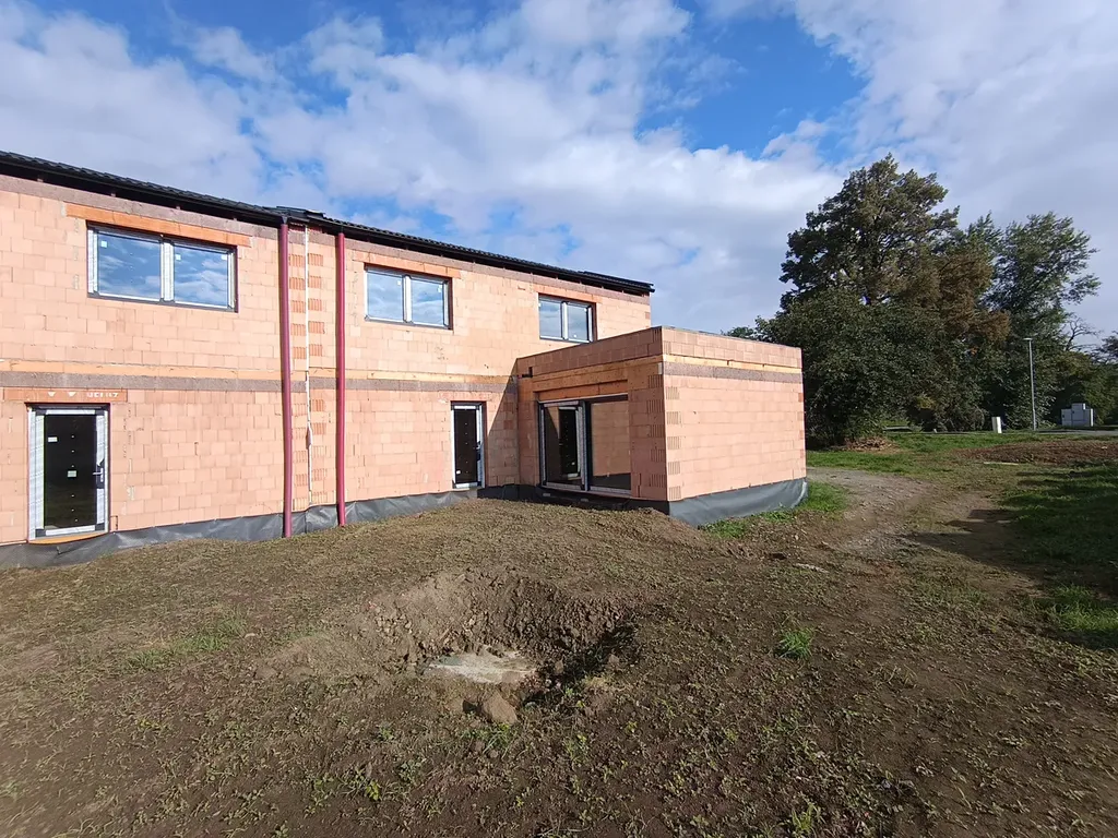 Další technická specifikace domu - základové pasy s podkladní deskou včetně hydroizolace (pod obvodovým zdivem a příčkami), keramické zdivo Heluz tl. 440 mm (dům není potřeba kontaktně zateplovat), překlady okenních otvorů Heluz, monolitický železobetonový překlad s integrovanou přípravou pro předokenní žaluzie, stropní panely Spiroll, schody železná konstrukce, střecha z dřevěných střešních vazníků a pálenou střešní taškou, okna a dveře plastová s trojsklem a kováním, vytápění domu bude řešeno tepelným čerpadlem a solárními panely na střeše domu. Dále jsou dokončeny veškeré zpevněné plocha před vstupem do domu a vjezdem do garáže.