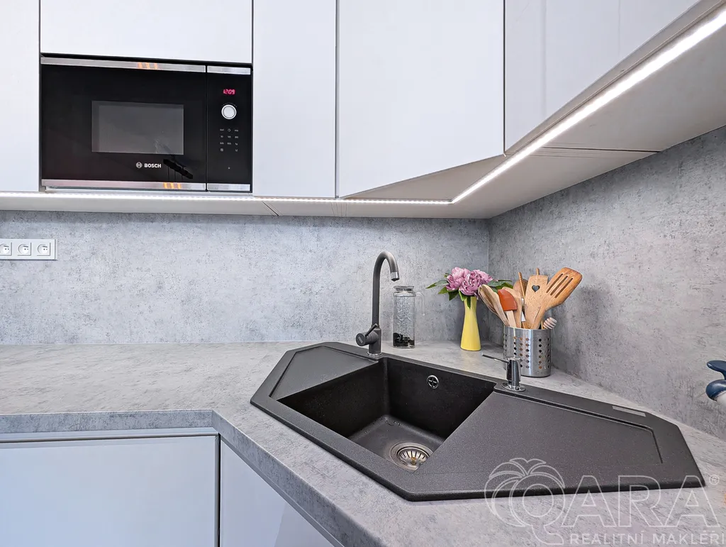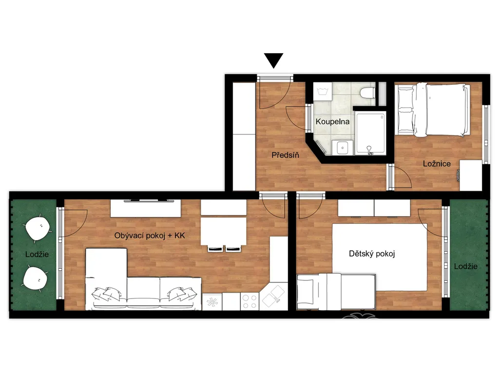 Dispozice bytu je praktická a vhodná jak pro rodinu, tak pro pár. Obývací pokoj má stěnu na míru a je propojen s kuchyňským koutem vybaveným vestavěnými spotřebiči (značky Bosch) a má přímý vstup na lodžii. Dalšími místnostmi jsou samostatná ložnice a dětský pokoj, ze kterého je vstup na druhou, zasklenou lodžii. Koupelna nabízí prostorný sprchový kout o rozměrech 140 × 90 cm, umyvadlo, WC, topný žebřík, přípojku na pračku a podlahové topení. V chodbě jsou umístěny vestavěné skříně poskytující dostatek úložného prostoru. Byt je vybaven bezpečnostními vstupními dveřmi a kvalitní dubovou podlahou.