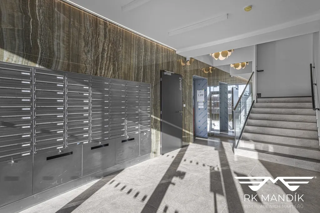 K dispozici je koupelna se sprchovým koutem, toaletou, umyvadlem a zrcadlem, dále s přípravou/přípojkou na pračku a topným tělesem. Součástí bytu je také praktická komora vhodná jako úložný prostor či menší šatna.