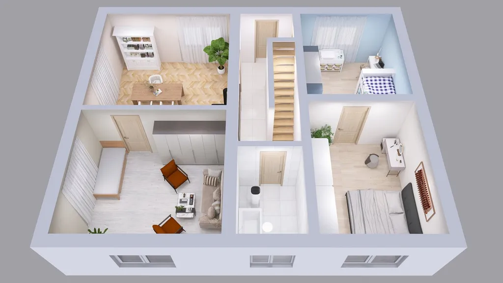 Dispozice: vstupní chodba se schodištěm, dvě ložnice vlevo od vstupu, koupelna s vanou a WC, kuchyně s jídelnou a obývací pokoj vpravo od vstupu. V patře se pak nachází původní obytné podkroví, kde byla další kuchyně a pokoje. Momentálně je prostor otevřený a připravený na realizaci dle požadavků nového majitele.