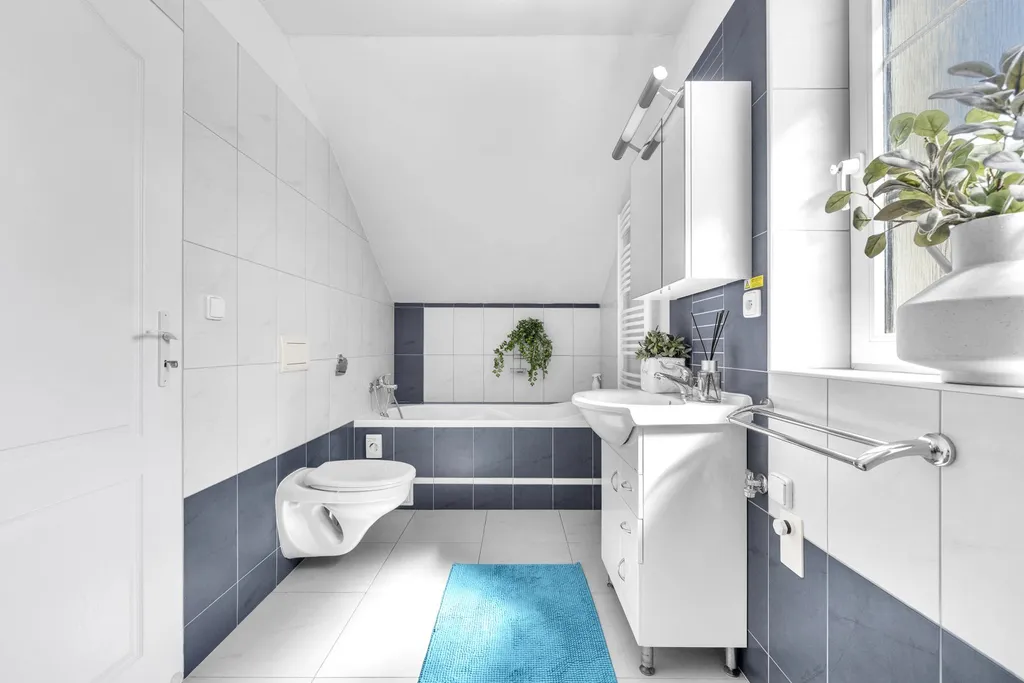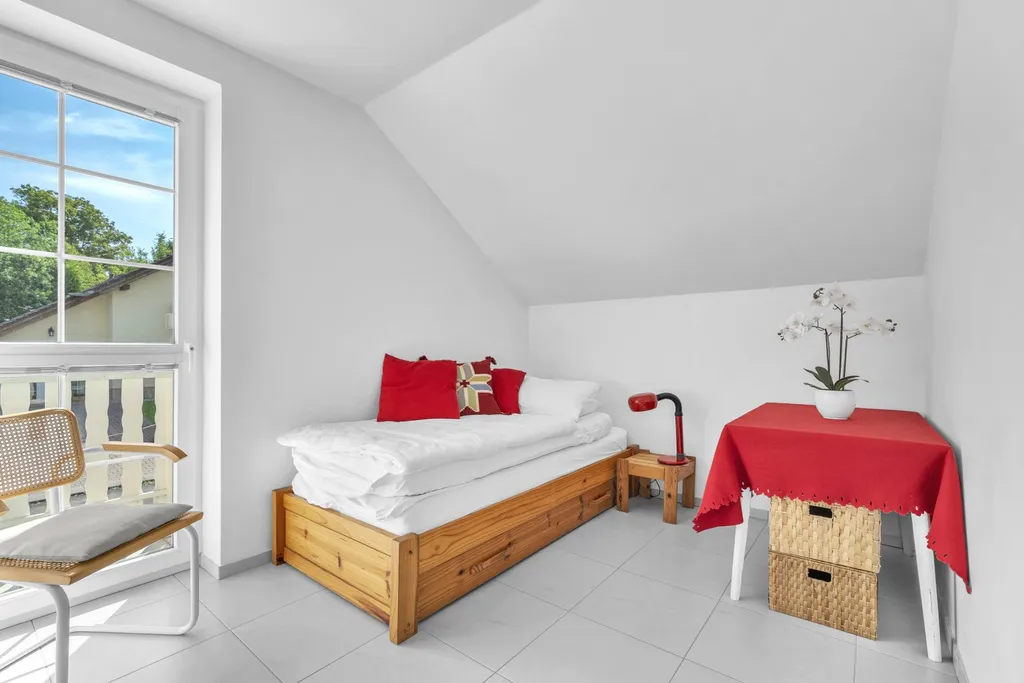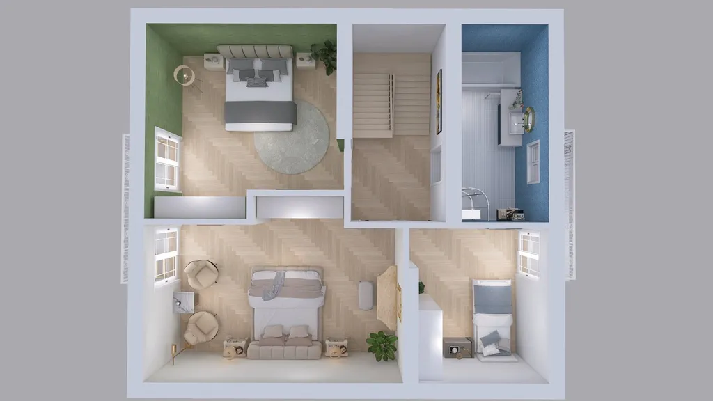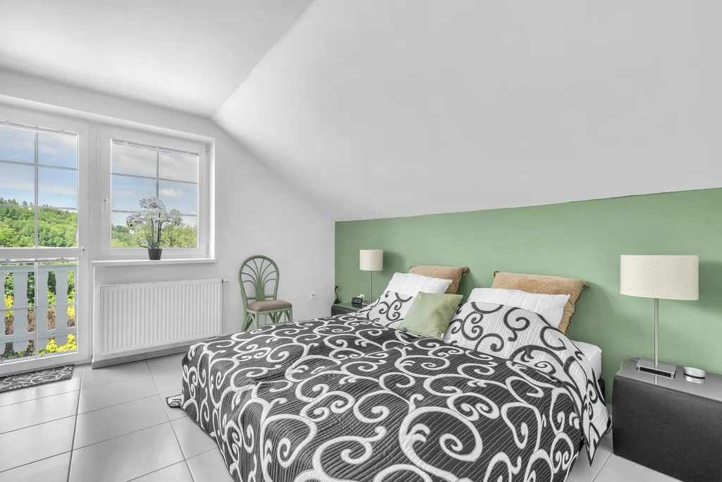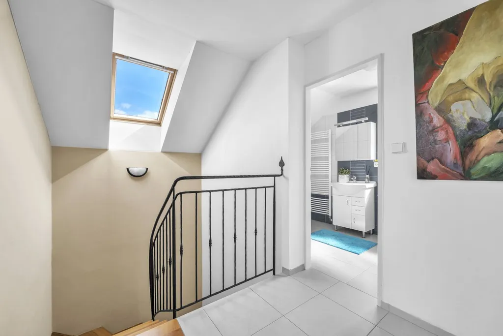 Obytné podkroví - koridor, koupelna s vanou, sprchovým koutem a WC, menší ložnice s balkonem, 2 větší ložnice se společným balkonem.