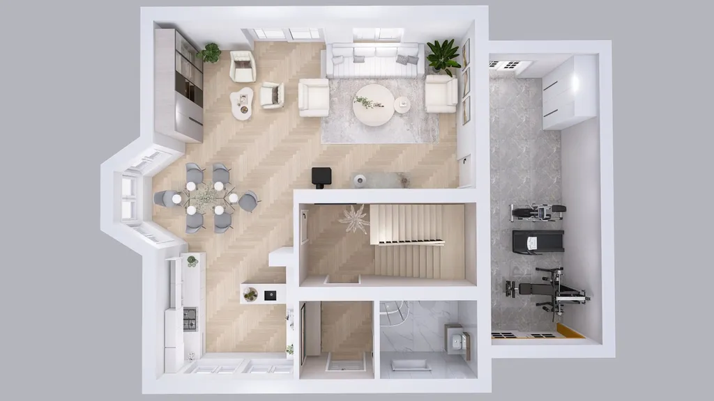 Přízemí: zádveří, koupelna se sprchovým koutem a WC, chodba se schodištěm do patra, kuchyně propojená s jídelnou a obývacím pokojem, technická část s původní garáží a vedlejším vstupem na terasu. Terasa je přístupná jak z obývacího prostoru, tak z technické místnosti.