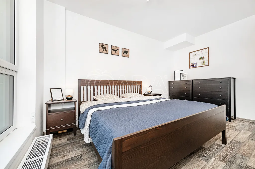 Byt se nachází ve spojovací části dvou věží rezidence, což zajišťuje snadný přístup z výtahu i z parkovacích pater.