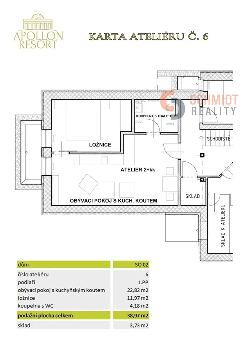 Apartmán s podlahovou plochou 38,9m2 je součástí uzavřeného Apollon Resortu, který představuje areál se třemi samostatnými ubytovacími objekty umístěnými naproti lázní Lednice.