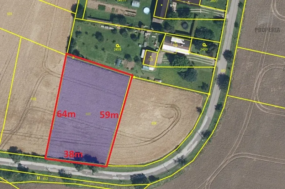 Pozemek má přímý přístup z obecní asfaltové komunikace. Jednou ze svých stran bezprostředně navazuje na zastavitelnou část obce, kde se nachází parcely se stávajícími rodinnými domy. Nachází se tedy na okraji obytné zástavby. Šířka parcely cca 38m, hloubka cca 60m.