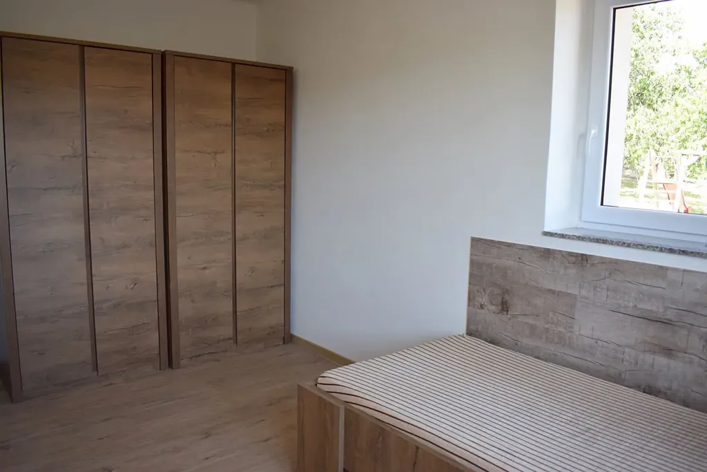 V Těšovicích u Prachatic, pronájem zrekonstruovaného domu o velikosti 4+ 1. Sestává se: v přízemí chodba, šatna, technická místnost, WC, velká společná kuchyně vybavená kuchyňskou linkou (mikrovlnná trouba, elektrický sporák se sklokeramickou deskou, digestoř, lednice), velký stůl se židlemi, pokoj se skříní a postelí. V patře 3 pokoje, dvě samostatné WC mísy, dvě sprchy a umyvadla, úložný prostor. Celkem je zde 8 postelí s nočními stolky a osm šatních skříní. Před domem možnost venkovního posezení. Majitel rekonstruoval nabízenou nemovitost za účelem pronájmu firmám pro ubytování řemeslníků. Do Prachatic 5 km, na přechod Strážný 35 km. PENB nebyl dodán, proto uvádíme třídu G. Majitel požaduje kauci ve výši jednoho nájemného + provize RK jeden nájem.