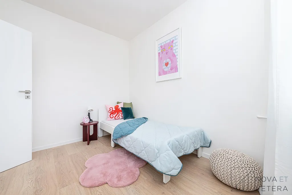 Jednotka je orientována na dvě světové strany - západ a sever. Světlý obývací pokoj disponuje vstupem na lodžii o velikosti 6 m² a s odděleným kuchyňským koutem. K dispozici jsou tři samostatné pokoje, které mohou sloužit jako ložnice, dětský pokoj, pracovna nebo pokoj pro hosty. Dva z pokojů mají vlastní vstup na lodžii, jedna o velikosti 3 m² a druhá 4,5 m². Moderní koupelna je vybavena sprchovým koutem a toaletou, druhá toaleta je samostatná. Vstupní chodba a samostatná místnost, která může sloužit jako komora nebo šatna nabízí dostatek úložného prostoru. K bytu náleží sklepní kóje o velikosti 2 m².