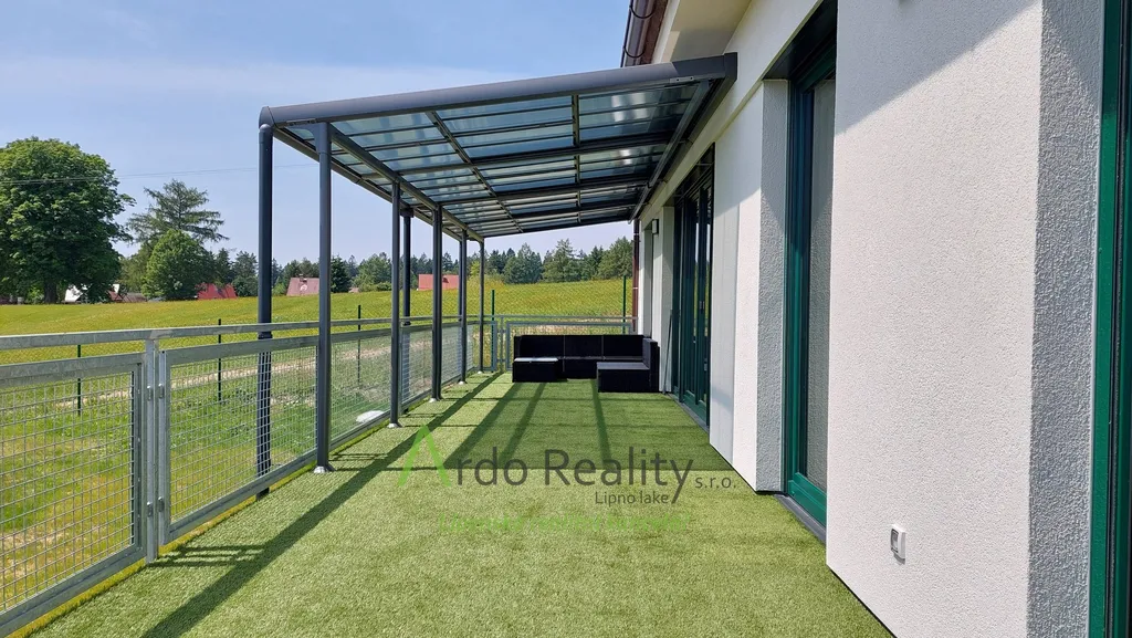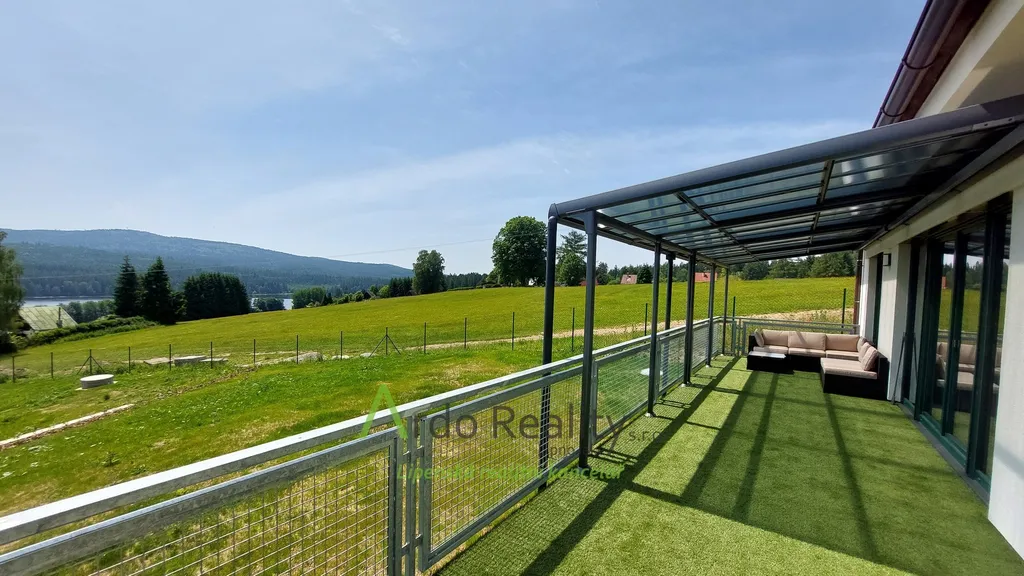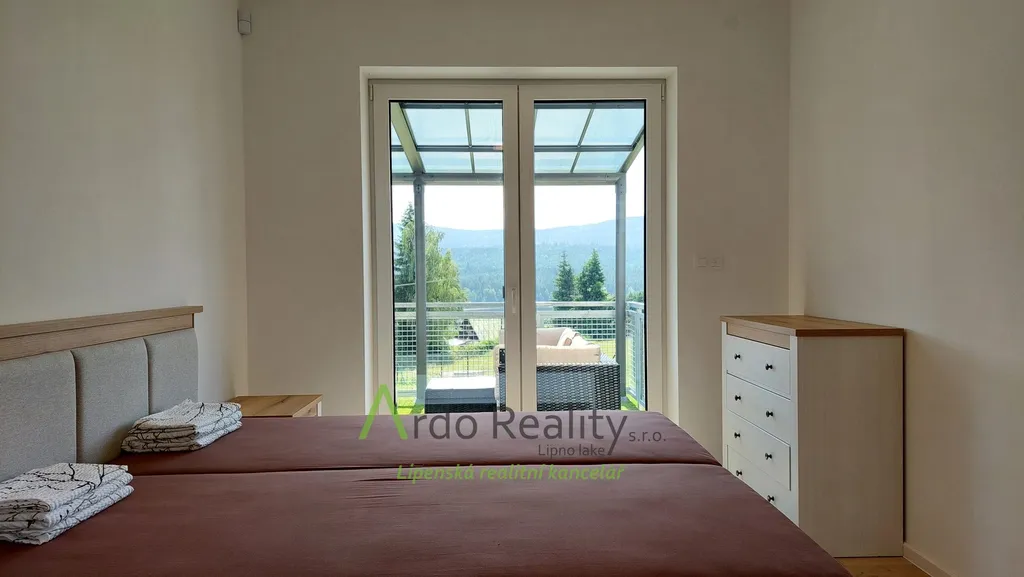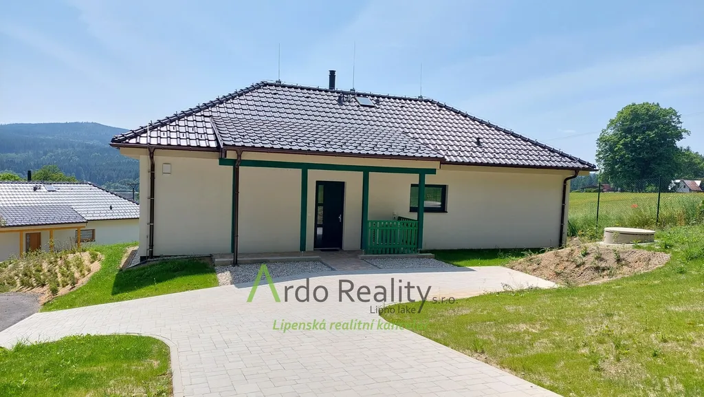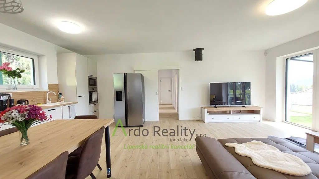 DLOUHODOBÝ PRONÁJEM na dobu určitou 5 let nebo dle dohody, s cílem udělat nájemcům radost, aby přijali a užívali celý dům i s pozemkem jako opravdoví vlastníci. Právě byla dokončena stavba nadstandardních šesti stejných domů u lázeňského městyse Frymburk, téměř na břehu Lipenského jezera. Prezentujeme zde bezbariérový bungalov, který je situován tak, aby prostorná terasa byla orientována jižně, s výhledem na jezero. Tento majitelé vybavili, ten Vám předkládáme jako vzorový a ten se bude pronajímat tedy jako poslední. Domy byly postaveny za použití nejmodernějších technologií, jsou energeticky velmi úsporné, vytápěné německým tepelným čerpadlem Viessman vzduch-voda, s podlahovým topením v celém domě. V obývacím pokoji se nachází ale i komín jako příprava pro krbová kamna nebo krb. Stavba je zděné konstrukce Porotherm 30 cm, zdi jsou izolovány 15 cm polystyrénem, stropní izolace je 18 cm, okna jsou trojitě zasklená a před všemi jsou instalovány rolety s elektrickým ovládáním. Střecha je valbové konstrukce a krytina keramická německého výrobce Roben. Půda je přístupná po skládacím schodišti. Dispozičně je dům řešen takto: Ložnice rodičů, která má k dispozici vlastní koupelnu se sprchovým koutem a WC s bidetovým mechanizmem, dále prostorný obývací pokoj s vybavenou kuchyní Schüller, jejíž pracovní deska se dřezem Blanco, se skříňkami a spotřebiči Elektrolux zabírá celou délku místnosti. Je provedena příprava napojení vody a elektro na americkou lednici s výrobníkem ledu. V tomto pokoji je právě možnost nainstalovat jednoduše krbová kamna a tak si zajistit ve studených dnech příjemnou atmosféru. V druhé části domu jsou další dva pokoje, z nichž lze rovněž vyjít na prosluněnou terasu. Na konci chodby je pak samostatné WC s malým umyvadlem a poslední, ale neméně důležitou místností je parádní koupelna s volně stojící vanou, sprchovým koutem a umyvadlem. Před hlavními vstupními dveřmi je ochranné zádveří, kde je venkovní jednotka TČ a také provedena příprava elektro na možnost instalace nabíjecí stanice pro automobil, z něhož je teprve vstup do domu. Zde je úschovný prostor, je tu místo na velkou odkládací skříň a je odtud vstup do technické místnosti. Ta může také skrývat další pohodlnou skříň pro ukládání potřebných věcí, hlavně je zde vnitřní jednotka tepelného čerpadla, dále pak tlaková nádrž s ovládáním čerpání vody a také moderní úpravna vody Watex, která zajistí tu nejkvalitnější pitnou vodu. Zbývá zde ještě dost místa pro pračku a sušičku. Největší devizou tohoto domu je velká venkovní terasa cca 40 m2 s krásným výhledem, která je ze dvou třetin krytá variabilní odsouvací střechou. Tato terasa je propojena se všemi obytnými místnostmi domu. Dešťová voda je svedena do podzemní retenční nádrže o obsahu 4000 litrů s možným využitím k zalévání. Parkování je řešeno pro dvě auta na vlastním pozemku u domu. Každý dům má své vlastní zabezpečovací zařízení Jablotron, napojené na pult ochrany s výjezdem. Připojení internetu zajišťuje společnost Starnet. Jak jsme již zmínili, na fotografiích vidíte vybavený vzorový dům. K pronájmu je připraveno ostatních pět plně dokončených domů, které po dohodě můžete mít zařízeny stejně, obdobně, anebo si je můžete zařídit nábytkem dle svých představ. Celý oplocený areál je v mírném svahu pod lesem, v okolí je krásná čistá příroda. Relaxovat se dá v letním období, vodními sporty, cykloturistikou kolem přehrady, houbaření a výšlapy po šumavské přírodě. V zimním období se nabízí běžkování a sjezdové lyžování na Lipně, v Rakousku a Německu. K břehu Lipenského jezera dojdete pěšky za méně než 5 minut, Český Krumlov je vzdálen 30 km, České Budějovice 55 km, přívozem přes vodu na hraniční přechod do Rakouska Guglwald asi 15 km. Další podrobnosti Vám rádi sdělíme při osobním jednání. Tato chatová osada je vzdálena jen 10 minut jízdy od lázeňského městysu Frymburk. Frymburk získal tento status v loňském roce a v brzké době zde lázně opravdu vyrostou.