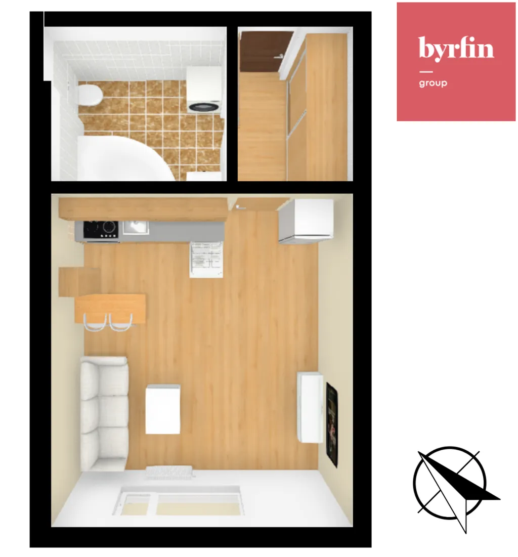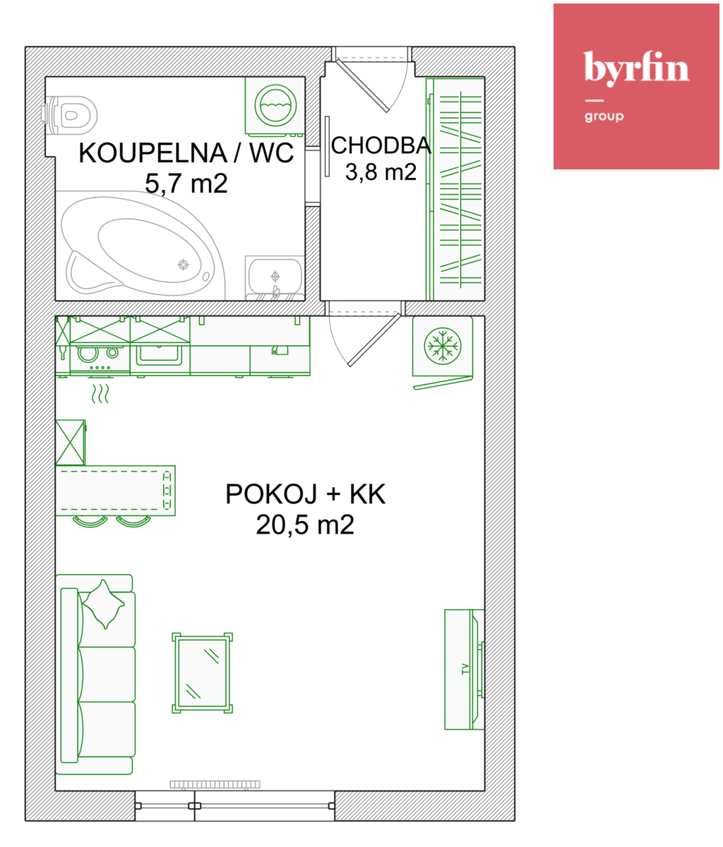 Dispozičně nabízí vstupní předsíň s vestavnými skříněmi, koupelnu s rohovou vanou, umyvadlem, toaletou a pračkou, a obytný prostor s kuchyňským koutem. Kuchyňská linka je vybavena troubou, elektrickou varnou deskou, digestoří, dřezem s baterií, vestavnou myčkou a barovým pultem s židlemi. Obytný prostor umožňuje umístění jak sedací soupravy, tak lůžka.