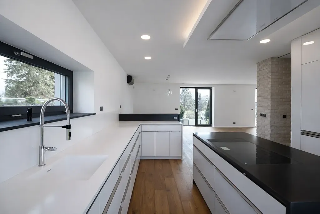 Dům o dispozici 4+kk je trojpodlažní. Spodní patro tvoří otevřená společenská zóna – obývací pokoj s moderním designovým krbem je propojený s kuchyní a jídelním koutem. Kuchyň je kompletně vybavena spotřebiči značky Siemens včetně vinotéky. Součástí přízemí je také koupelna se sprchovým koutem a toaletou.