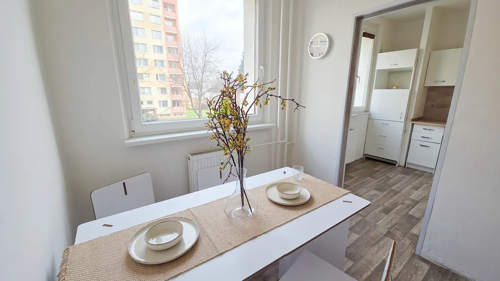 Byt se nachází ve 2. patře zatepleného panelového domu s výtahem. Dispozice 4+1 nabízí dostatek prostoru, přičemž kuchyně má okno s výhledem do zeleně a byt je díky orientaci příjemně světlý. Byt je v původním, udržovaném stavu, což dává novému majiteli možnost rekonstrukce dle vlastních představ, bez kompromisů spojených se staršími úpravami. Částečně vybavený byt je ihned k dispozici.