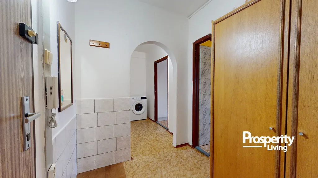 Dispoziční řešení bytu nabízí vstupní chodbu, prostorný obývací pokoj s kuchyňským koutem, ložnici a koupelnu s toaletou. Nabízený byt je v původním stavu, má umakartové bytové jádro, plastová okna. Podlahovou krytinu tvoří PVC. Velmi nízké měsíční náklady, lze získat na prohlídce. K bytu náleží sklepní kóje.