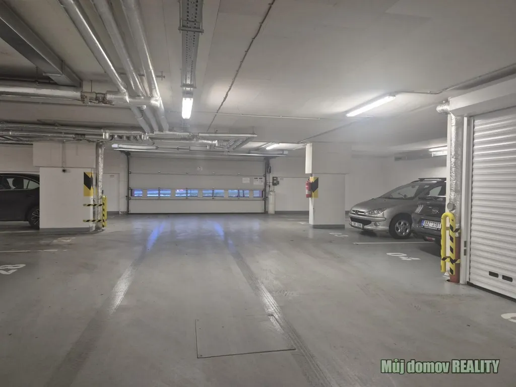 K bytu náleží **garážové stání ve společné garáži v suterénu domu**. V suterénu je dále k dispozici **místnost pro kola**.