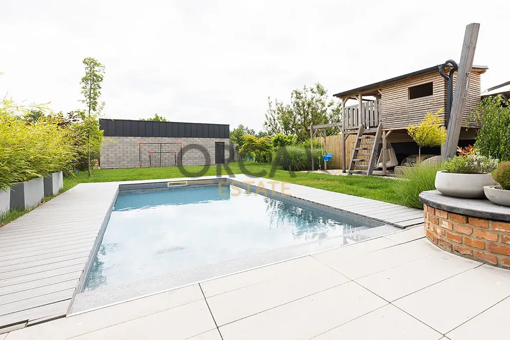 Dominantou celého domu je prostorný obývací pokoj s kuchyní a jídelnou se vstupem na terasu, na kterou navazuje venkovní bazén (3 x 6,5 m, solární ohřev) s krásnou udržovanou zahradou, která se pyšní pokládaným travním kobercem se závlahovým systémem a okrasnými keři a stromky. Bazén je v dohledu i z kuchyně. Proto si děti mohou klidně hrát ve vodě a rodiče je neztratí z dohledu. Na zahradě se dále nachází zahradní dětský domek s posezením a také trampolína. Velkou výhodou je přítomnost vlastní studny, která byla vybudována pro účely zalévání.
