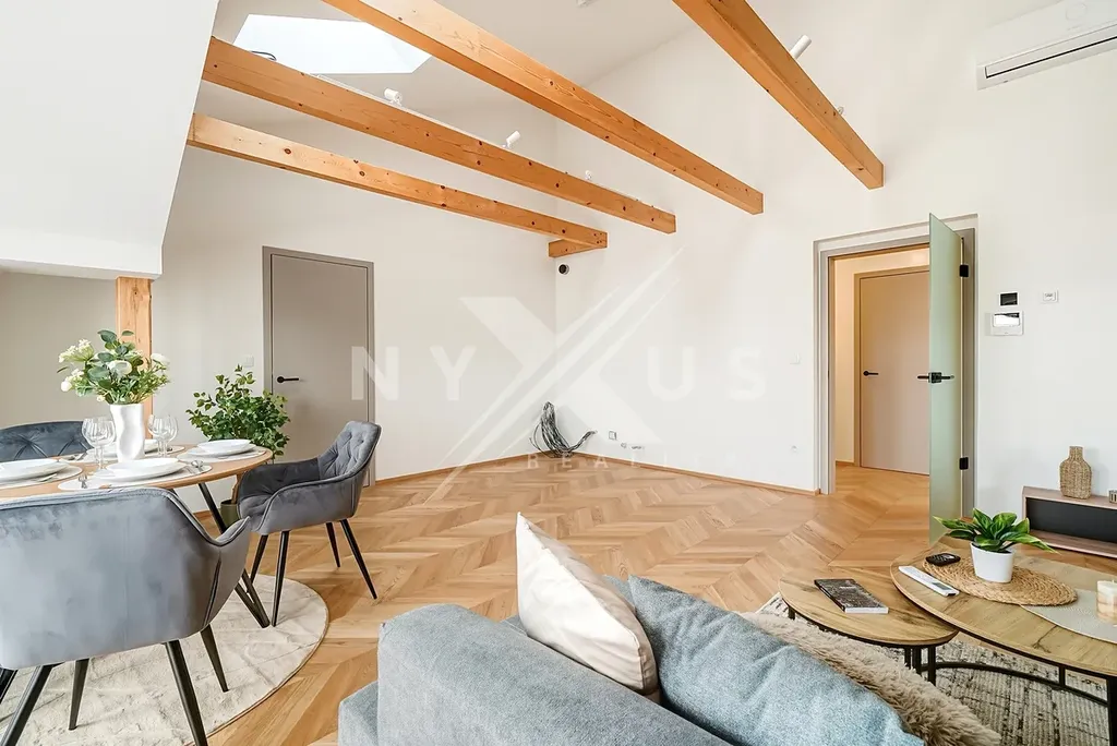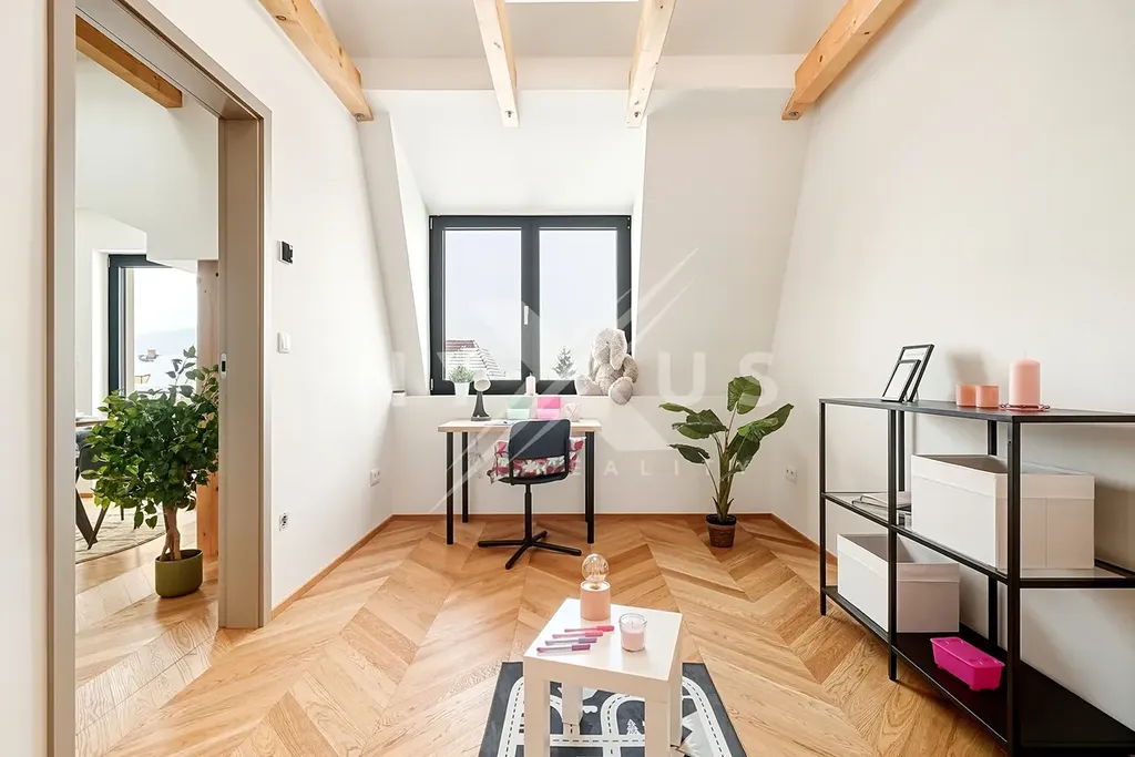 V nejvyšším podlaží kompletně zrekonstruované prvorepublikové vily se nachází tento výjimečný byt 4+kk o ploše 104 m², doplněný o terasu 6 m², půdní prostor 20 m² a sklep 9 m². Vila nabízí pouze tři bytové jednotky, což zajišťuje klid, soukromí a komorní atmosféru bydlení. Součástí prodeje jsou dvě venkovní parkovací stání.