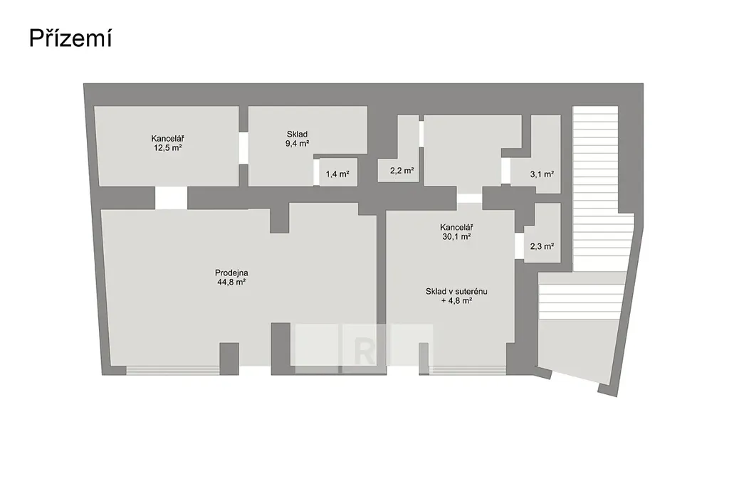 V přízemí se nacházejí 2 komerční prostory o velikosti 66,7 + 42,5m2