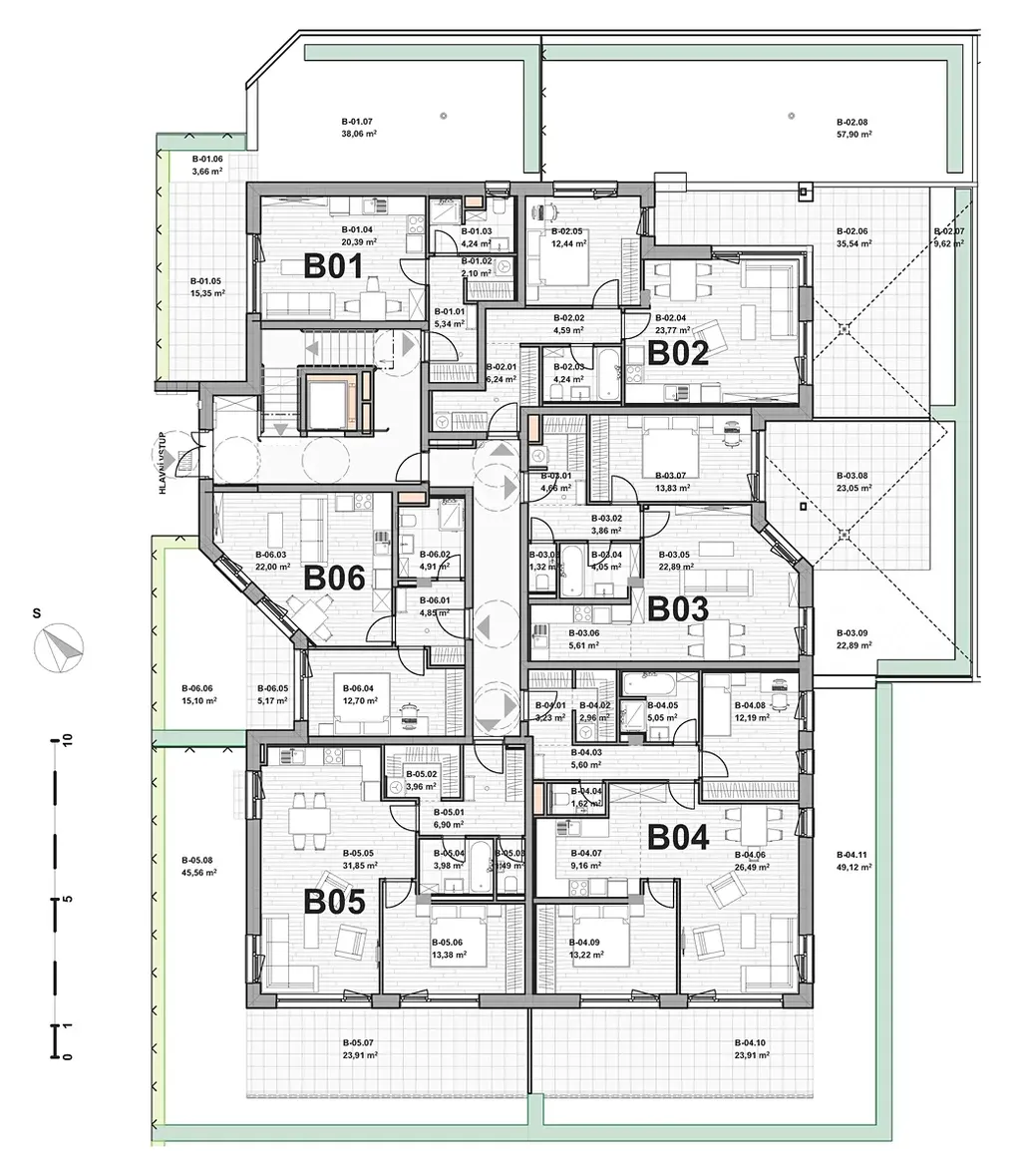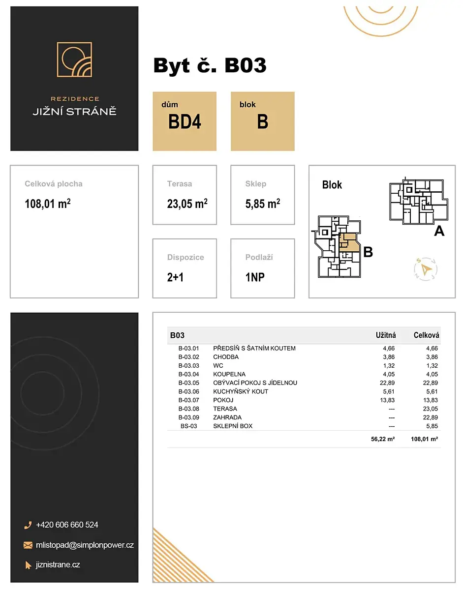 Do této kategorie patří i prezentovaný byt s označením BD4_B03 o dispozici 2+1 s celkovou plochou 108 m² (byt 56,22 m², terasa 23,05 m², zahrada 22,89 m² a sklep 5,85 m²).