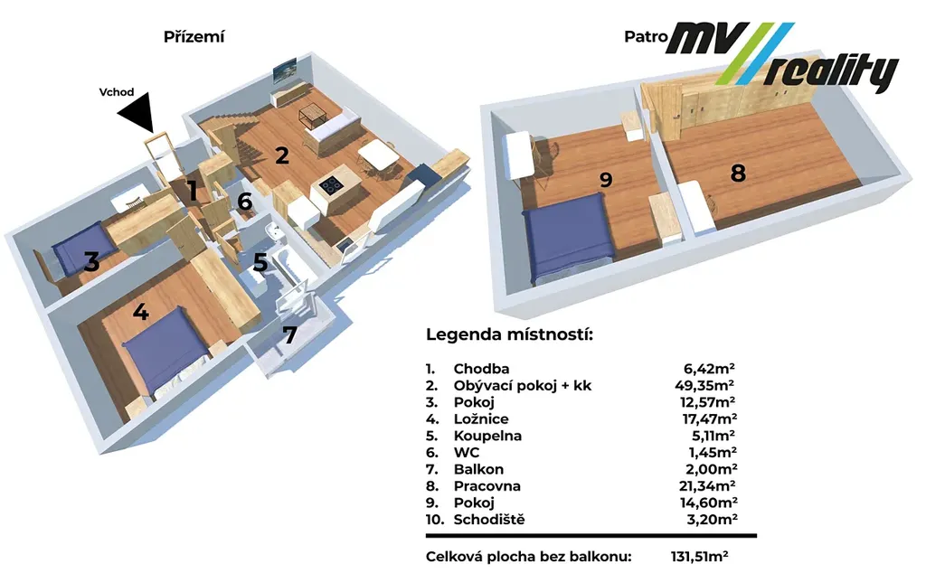 Dispozice v přízemí: vstupní chodba, obývací pokoj s kuchyňským koutem (indukční varnou deskou, troubou, mikrovlnkou, myčkou a americkou lednicí), koupelna s vanou, samostatné WC s umyvadlem a 2 pokoje. Schodištěm se dostanete do patra, kde je další pokoj a prostor využitelný jako šatna nebo pracovna.