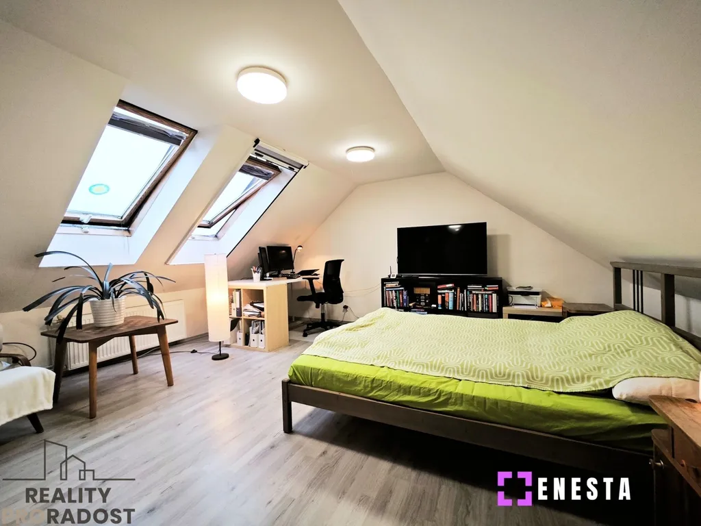 Klidová zóna se nachází v prvním patře, kde najdete hlavní ložnici s velkou vestavěnou skříní, dětský pokoj s klimatizací a menší pokoj, který skvěle poslouží pro hosty nebo jako pracovna. Chodba je chytře využita pro další vestavěnou skříň, která plní funkci šatny. Komfortní zázemí poskytuje velká koupelna vybavená vanou, sprchovým koutem, toaletou i bidetem. Pokud by vám tento prostor nestačil, v podkroví na vás čeká další velkorysá místnost o ploše 25 m², která v současnosti slouží jako kombinace ložnice a pracovny, ale její využití záleží jen na vašich potřebách.